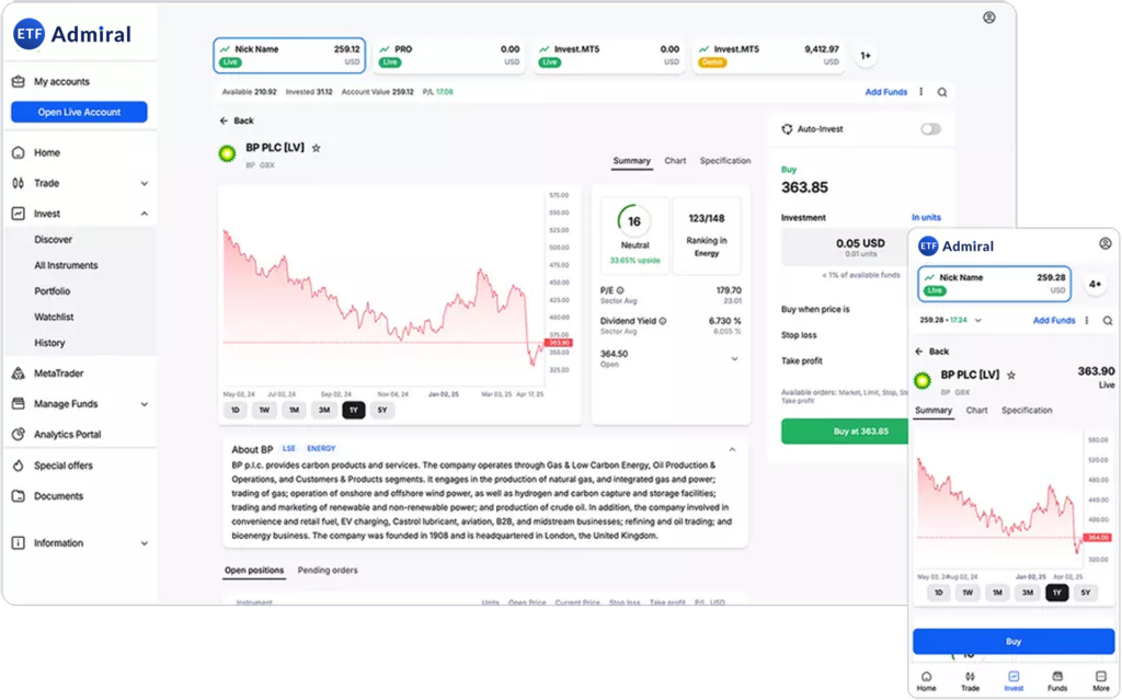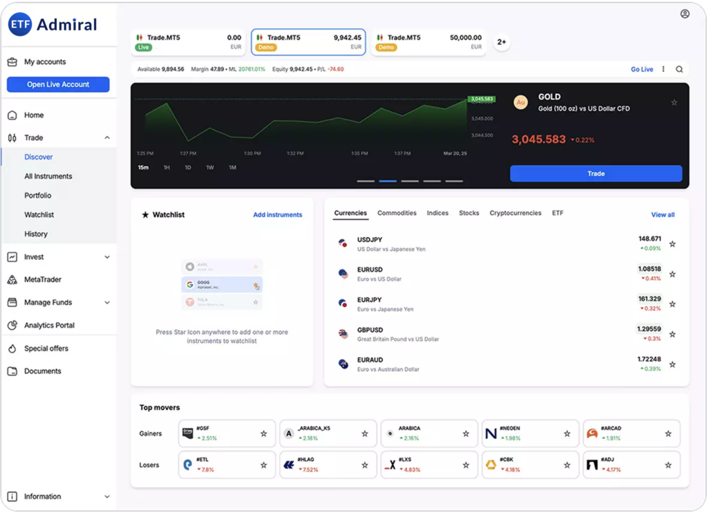 With the ETF Admiral Platform, you can access a wide range of financial instruments — including stocks, ETFs, Forex pairs, and various CFDs on commodities and indices.